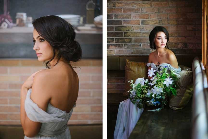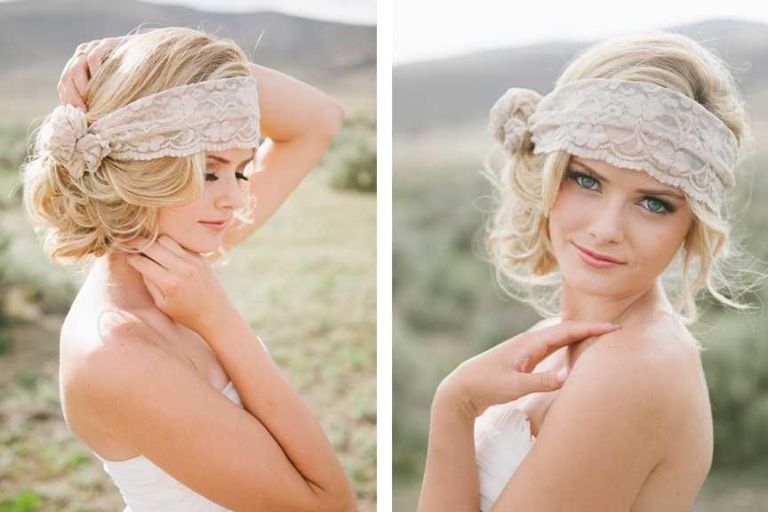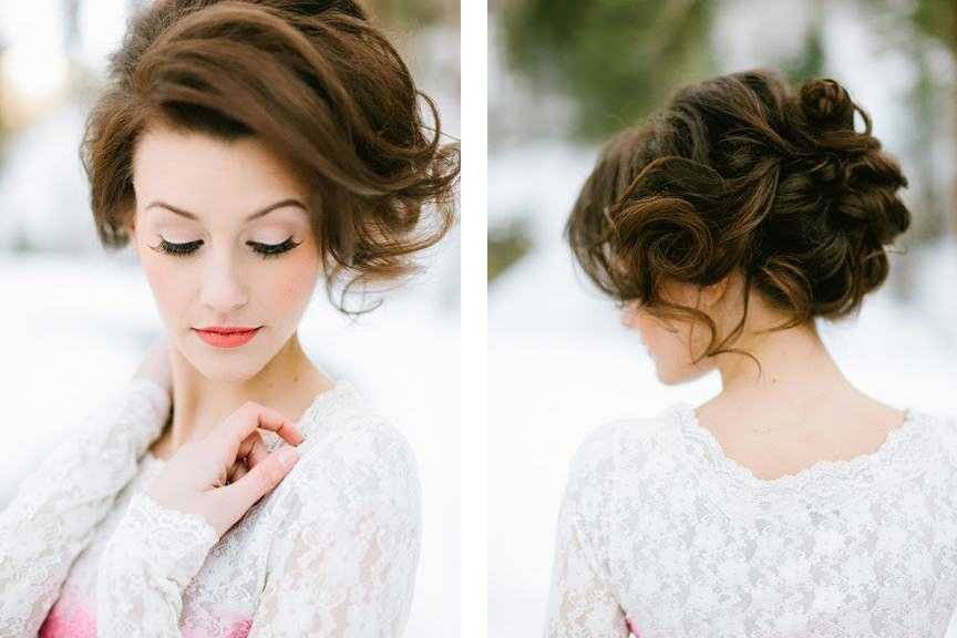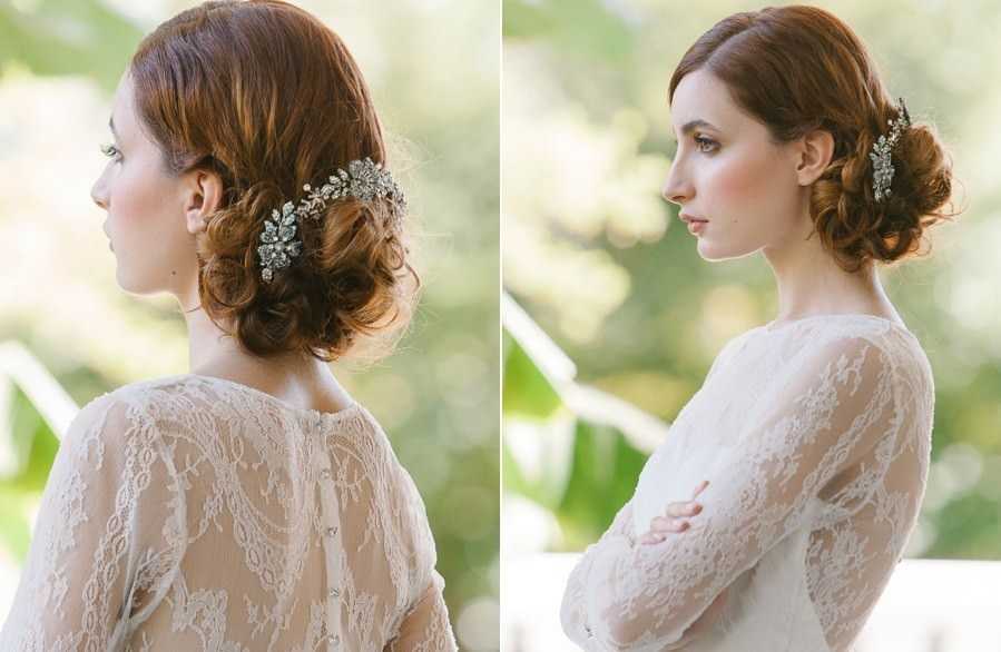 Это могут быть уложенные на одну сторону косы или завитые локоны, либо же аккуратный или нарочито небрежный пучок, из которого будут выбиваться пряди, красиво обрамляющие личико невесты. Также это могут быть уложенные на бок волнистые волосы в стиле 40-х.