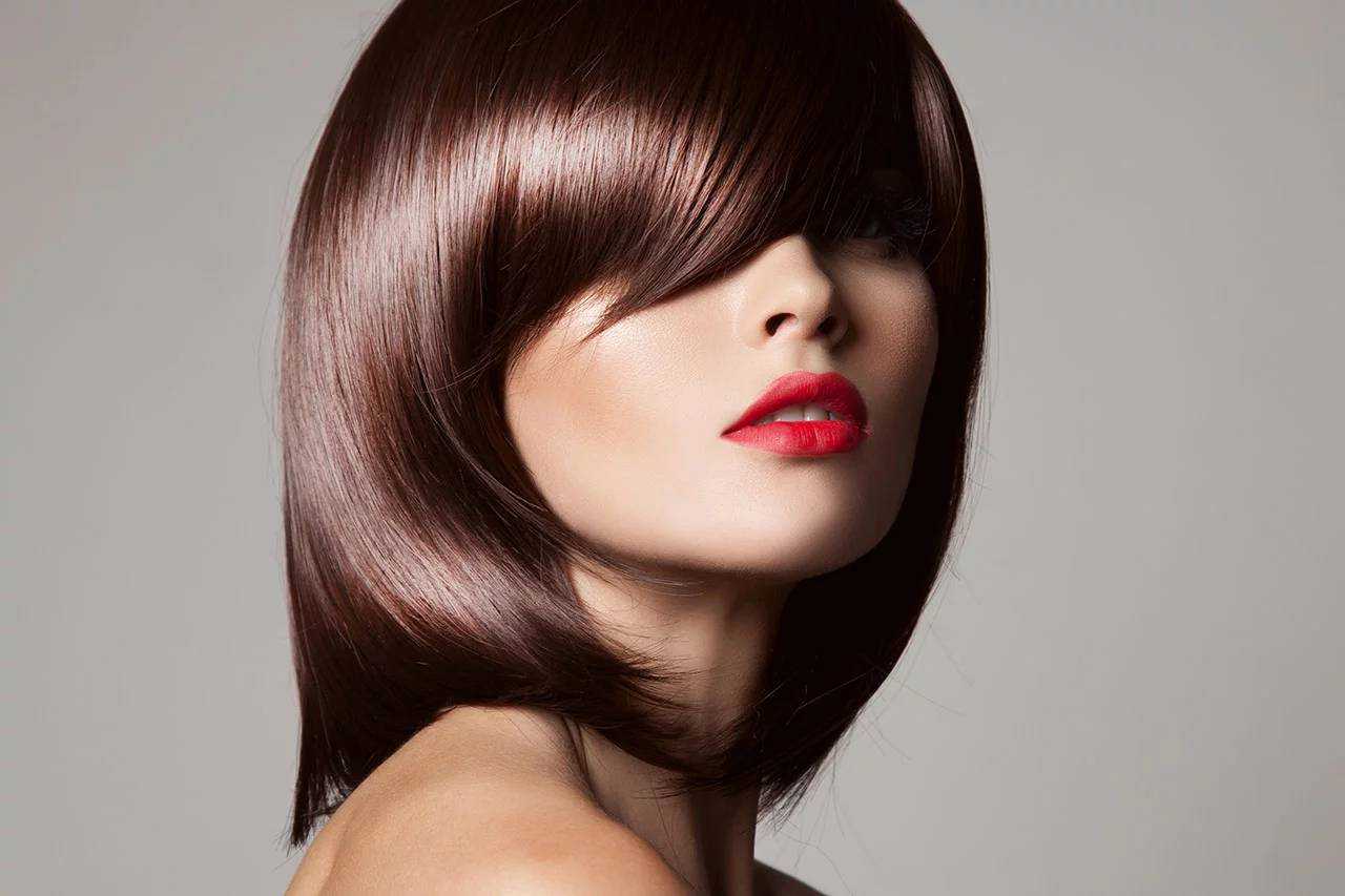 Элегантная асимметричная стрижка боб в сочетании с тёмным цветом волос прекрасно обрамляет ваши черты лица, подчёркивает ваши достоинства и скрывает недостатки.