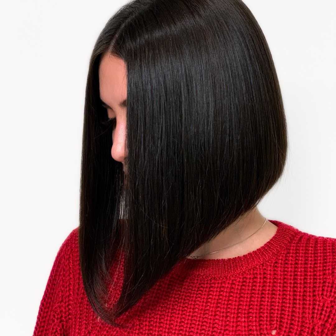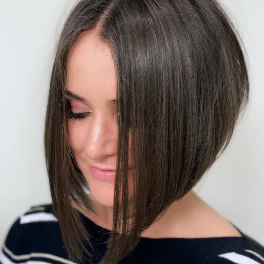 Если лицо женщины в форме треугольника, то подойдут варианты традиционного или удлиненного каре. Рекомендованная длина – немного ниже подбородка.