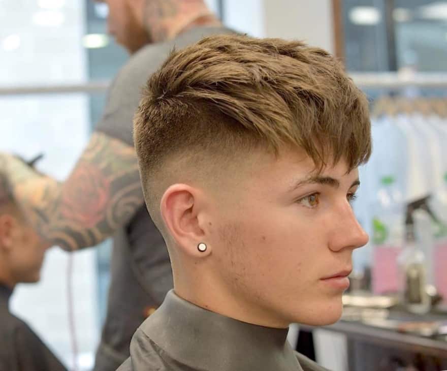 Средний фейд. В прошлом стрижку носили в основном военные. Эта форма выглядит наиболее мужественно, позволит выделиться из общей массы. Волосы по бокам и сзади снимаются очень коротко, переход начинается над ушами. Общий вид стрижки лаконичный, линии проходят строго и точно. Несмотря на такое выверенное строение, средний фейд позволяет проявить индивидуальность. Челку можно зачесать назад, сделать пробор (можно с выбриванием), можно применять средства для укладки с разным эффектом — гель, воск и другие.