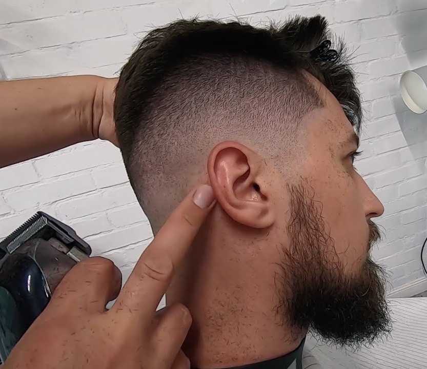 - Смена насадки. Основная часть стрижки fade закончена. Насадка меняется на номер два. Техника стрижки такая же. Линию перехода делают выше ушных раковин.