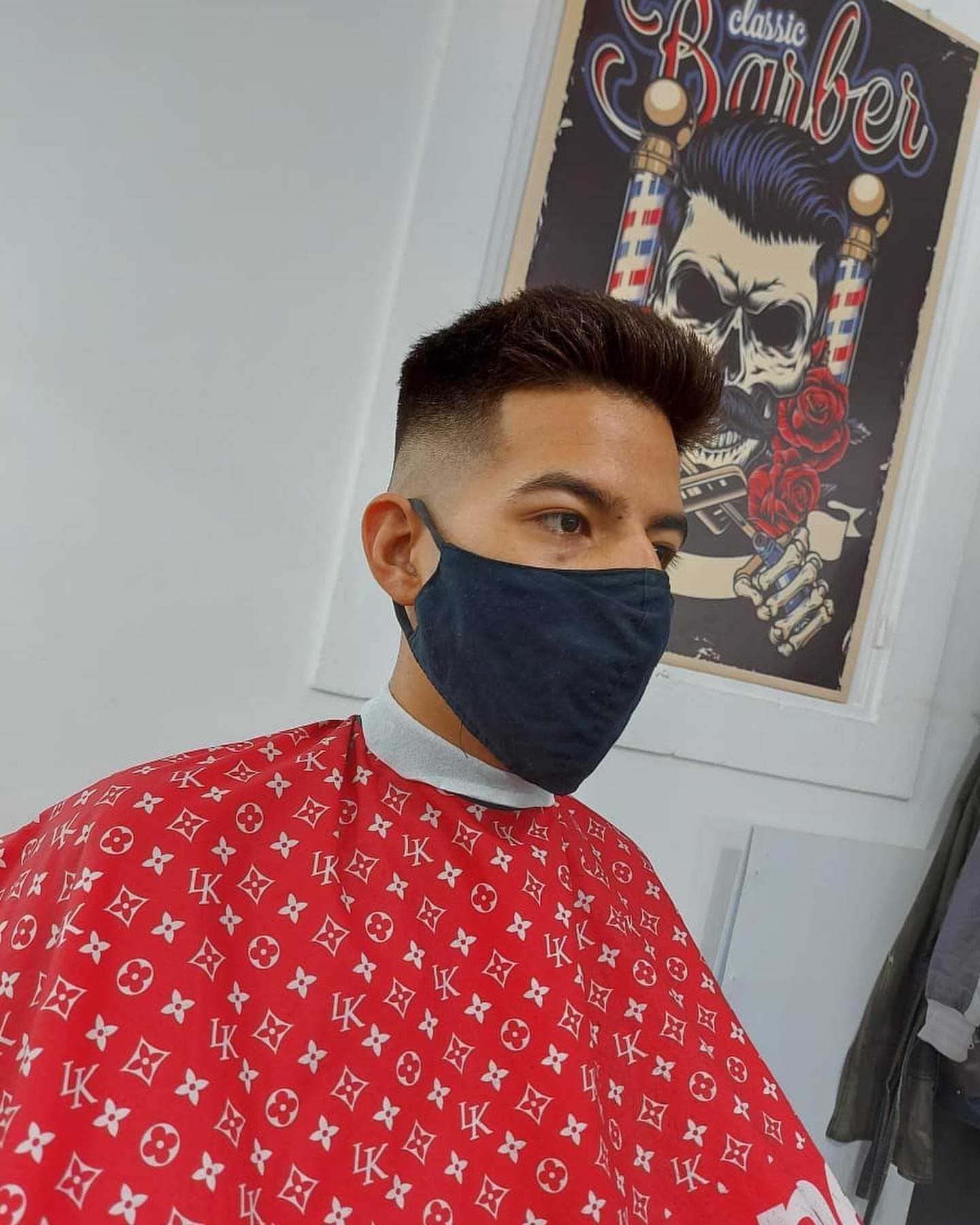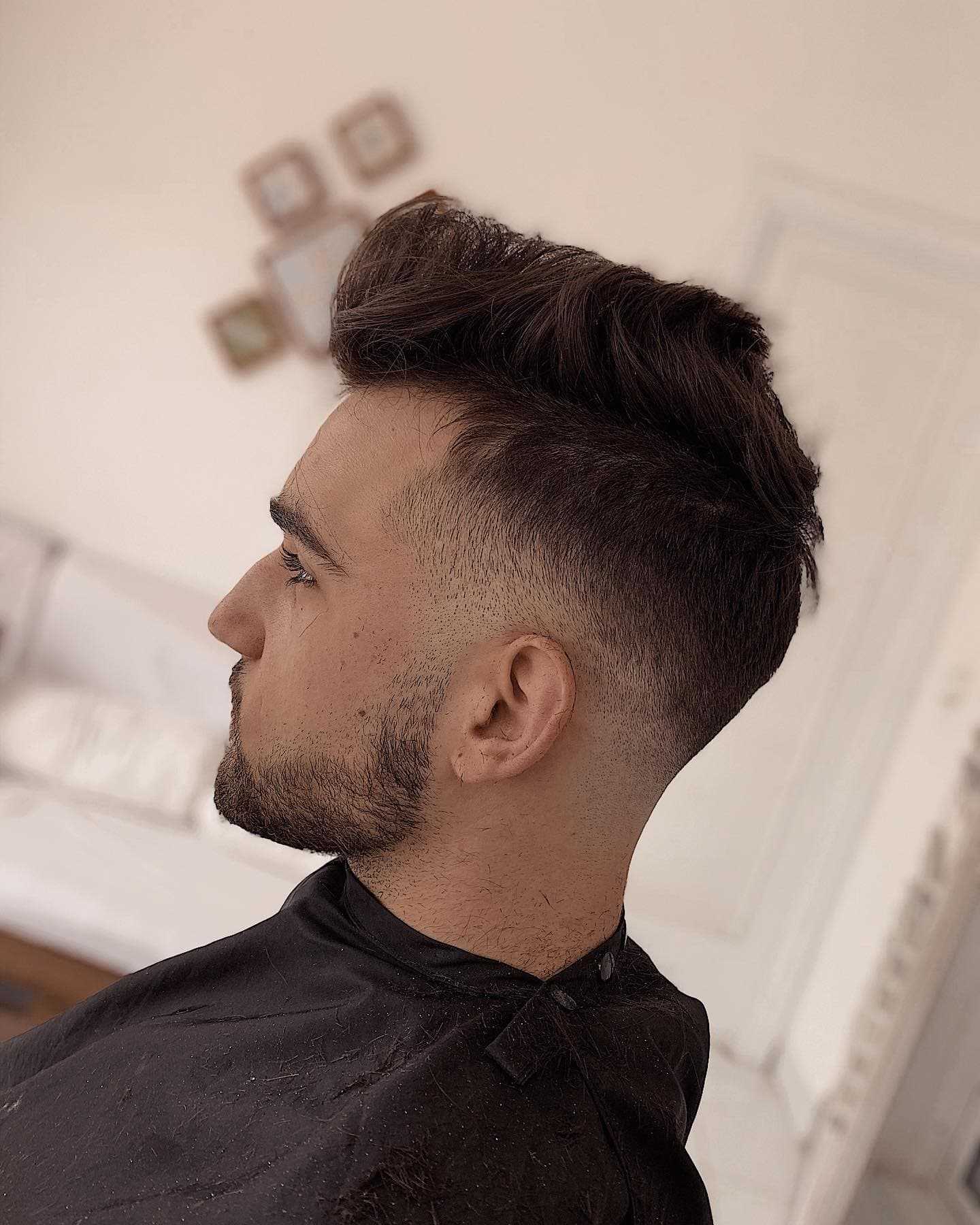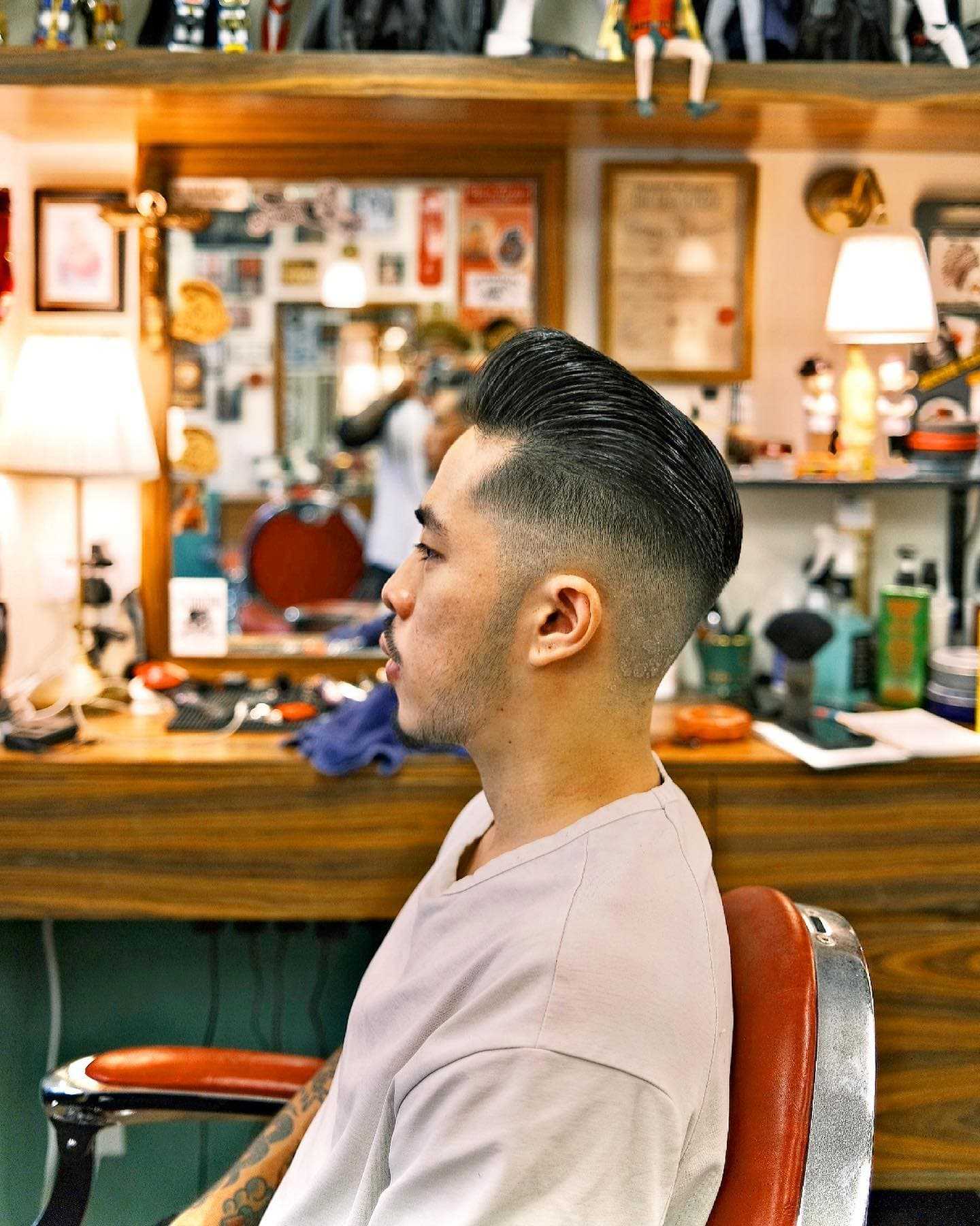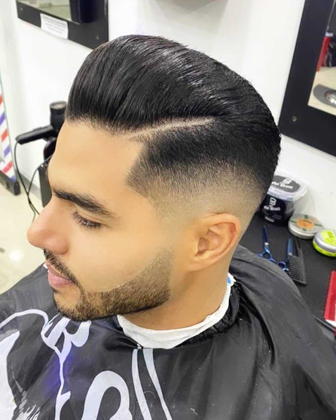 Когда особой необходимости в плавных переходах нет, можно использовать андеркат. Такая мужская стрижка с волосами назад подразумевает резкую разницу между максимально выбритыми висками и аккуратно удлиненным верхом. Верхние волосы образует некую шапочку, накрывающая височную часть.