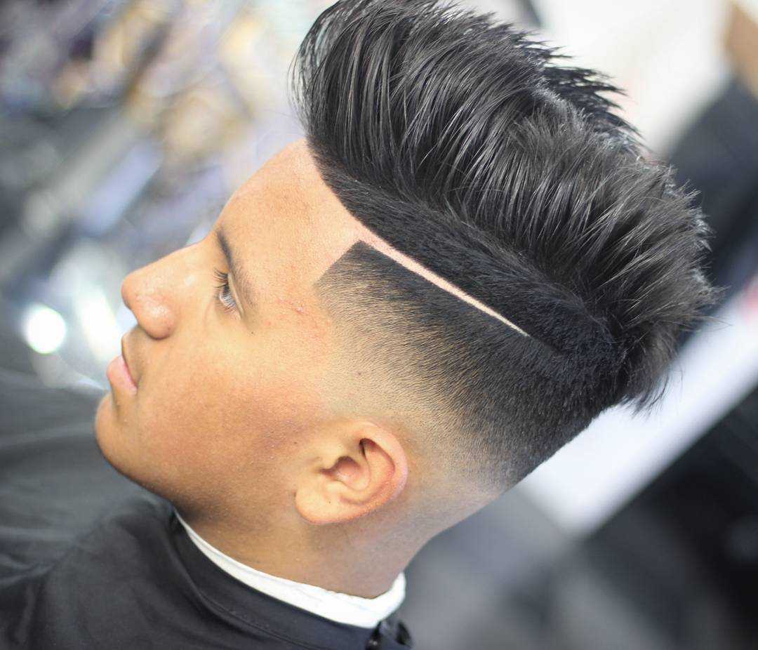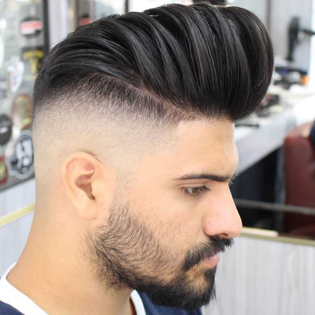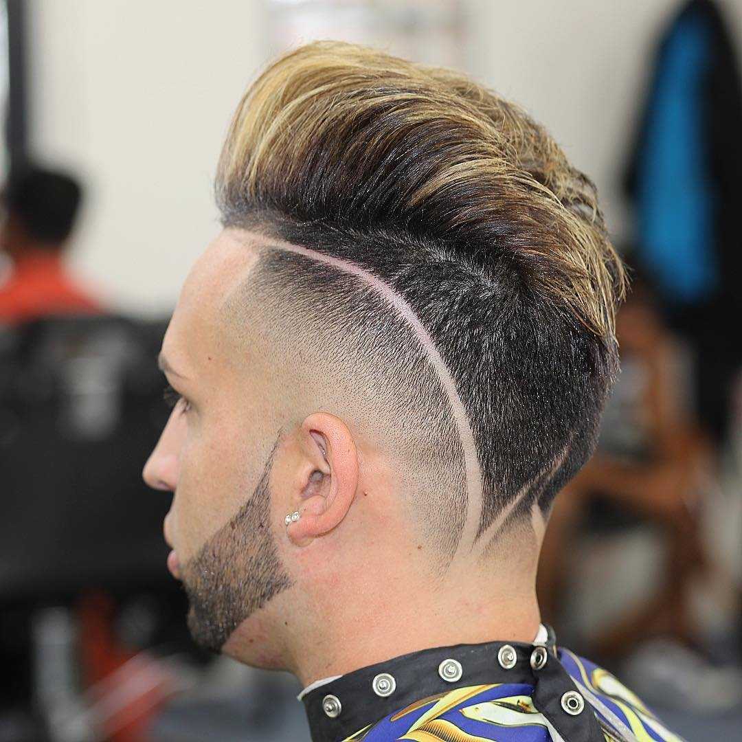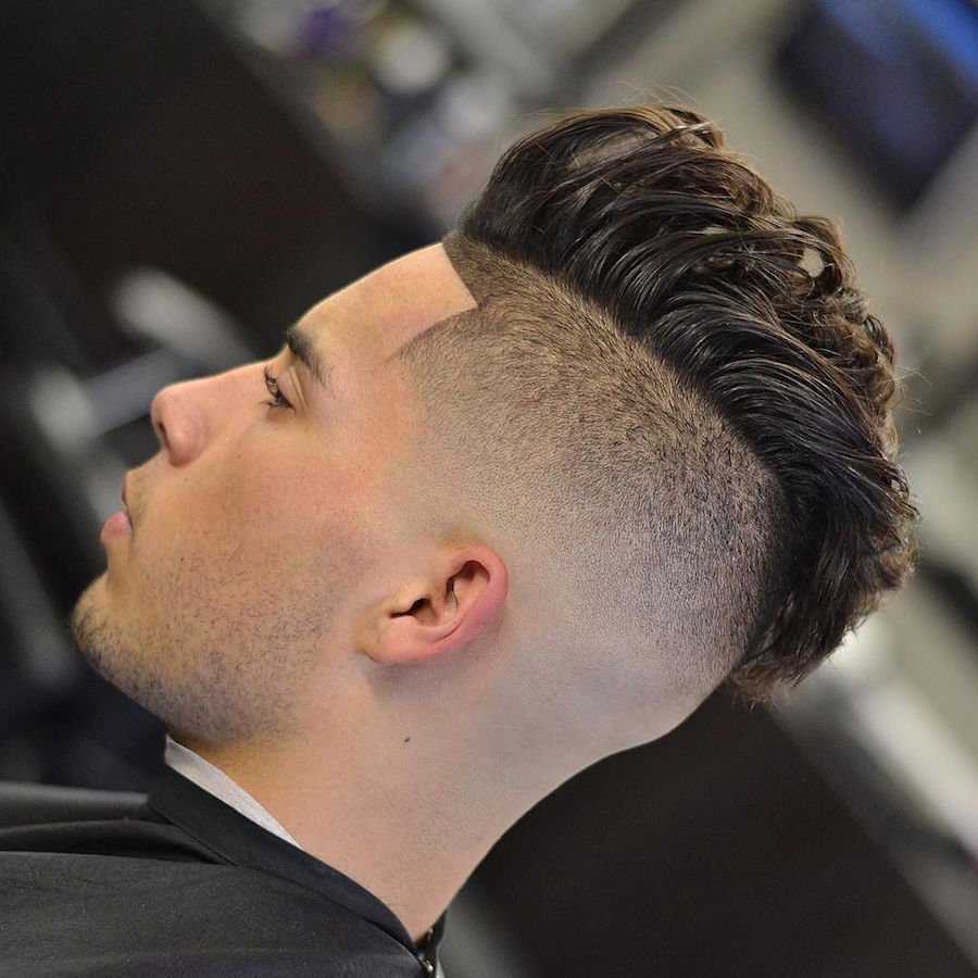 Еще один вариант одной из самых популярных причесок этого года. Высокое лысое выбривание сочетается с помпадуром наверху.