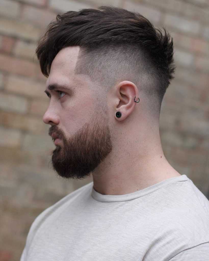 Эта прическа содержит в себе длинные волосы сверху и челку спереди, что хорошо контрастирует с низкими сторонами. Отлично выглядит с бородой.