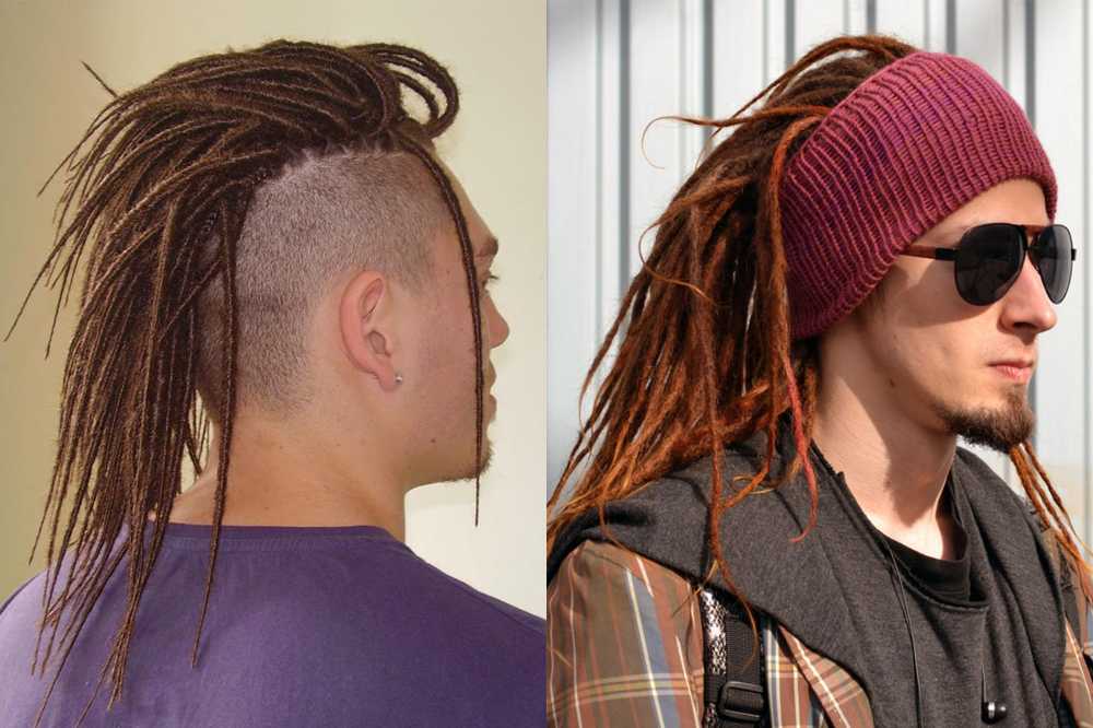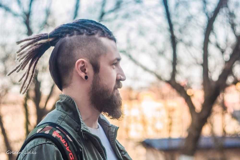 Mohawk с дредами. Сбритая височная и затылочная часть в сочетании с dreadlocks средней длины на темени выглядит очень эффектно. Такую прическу можно забрать в хвост или пучок, уложить в «птичье гнездо», поставить шипами.